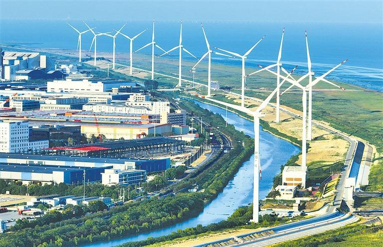 浙江省海宁市尖山新区钱塘江畔,陆上风电场风机叶片随风转动。该风电场装载25台风电机组,每年可发电约9000万千瓦时。近年来,当地大力发展光伏、风电等新能源,积极推广“清洁能源+储能”发电方式,持续提升能源利用效率。计海新/摄
