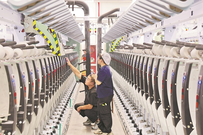 9月17日,江苏省南通市崇川区的江苏大生集团碳中和智慧纺纱工厂生产车间,工作人员正在进行设备调试。该工厂将通过先进技术集成,形成“智能+绿色”相融共生的发展形态,持续提高生产效率,降低单位产出能源资源消耗和碳排放。许丛军/摄