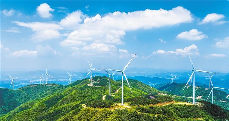 6月6日,江西省宜春市袁州区洪塘镇丰顶山风电场,一座座风车迎风旋转,为当地经济社会高质量发展注入源源不断的绿色动能。周亮/摄(中经视觉)