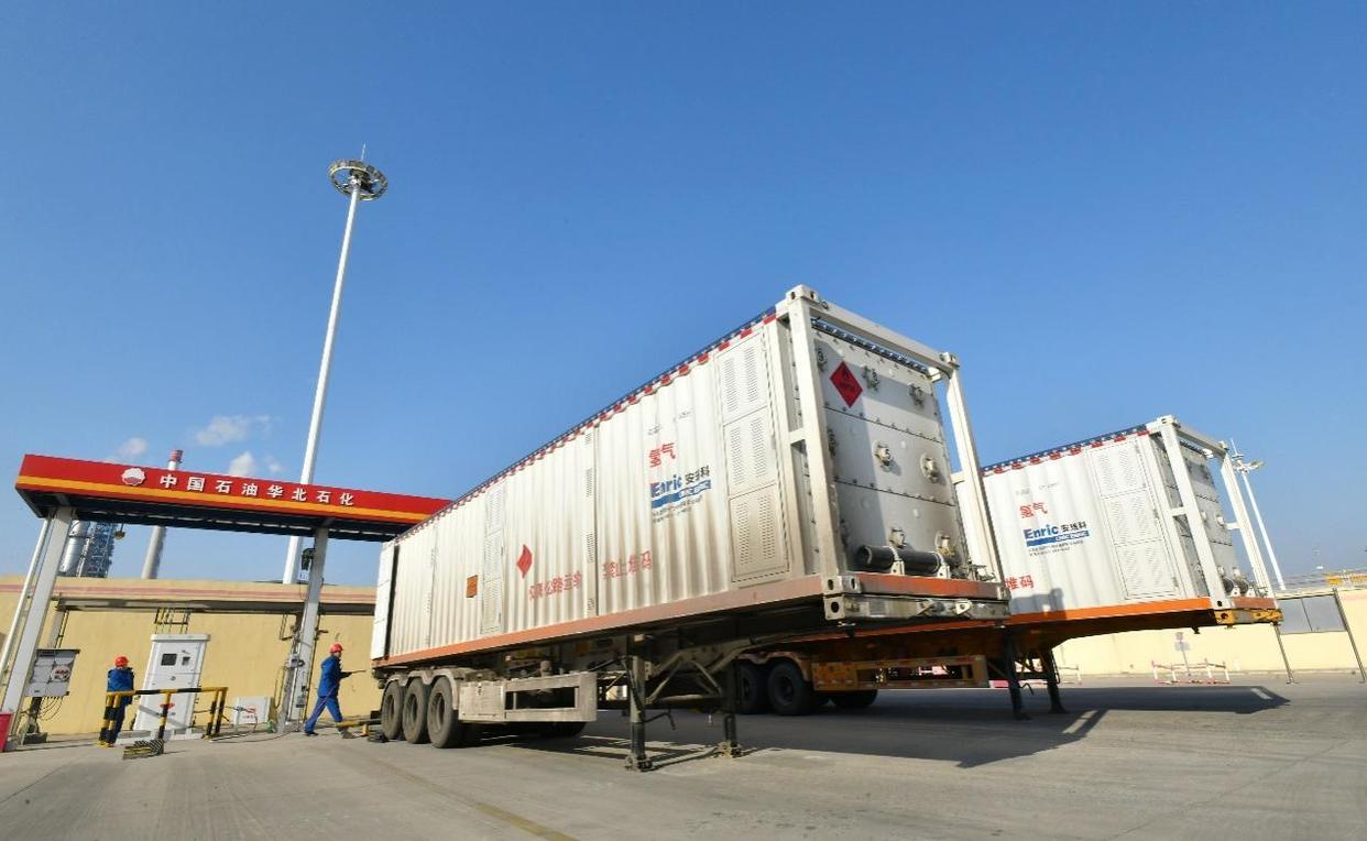 1月8日,位于河北省任丘市的华北石化公司氢能装车场,工作人员正准备为氢气管束车加注氢气。