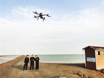 图为滨州市生态环境局沾化分局执法人员运用无人机对养殖企业开展环境问题隐患排查,确保不留死角,保障近岸海域水质持续改善。滨州市生态环境局供图