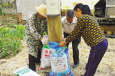 图为农户们将集中收割的油菜籽装袋。黄伟/摄