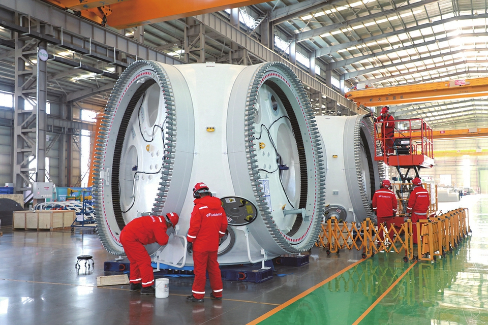 12月4日,山西省原平市原平中润循环再利用有限公司生产车间,工人正在组装风电机组。近年来,该公司依托原平绿电园区一体化生态体系,建起智能化大型风电机组及循环再利用风电机组智能组装线。