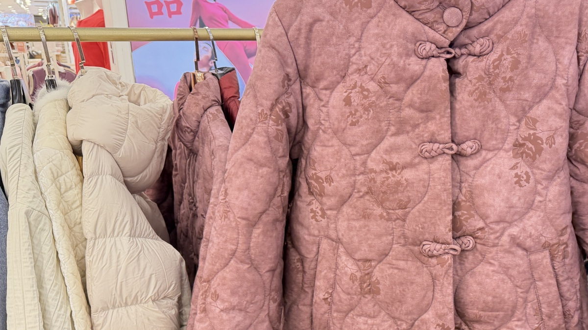 在宁波第二百货大楼的一家特卖女装店内,新进了不少色彩喜庆的新中式女装,材质与通常见到的不同,表面非常丝滑。