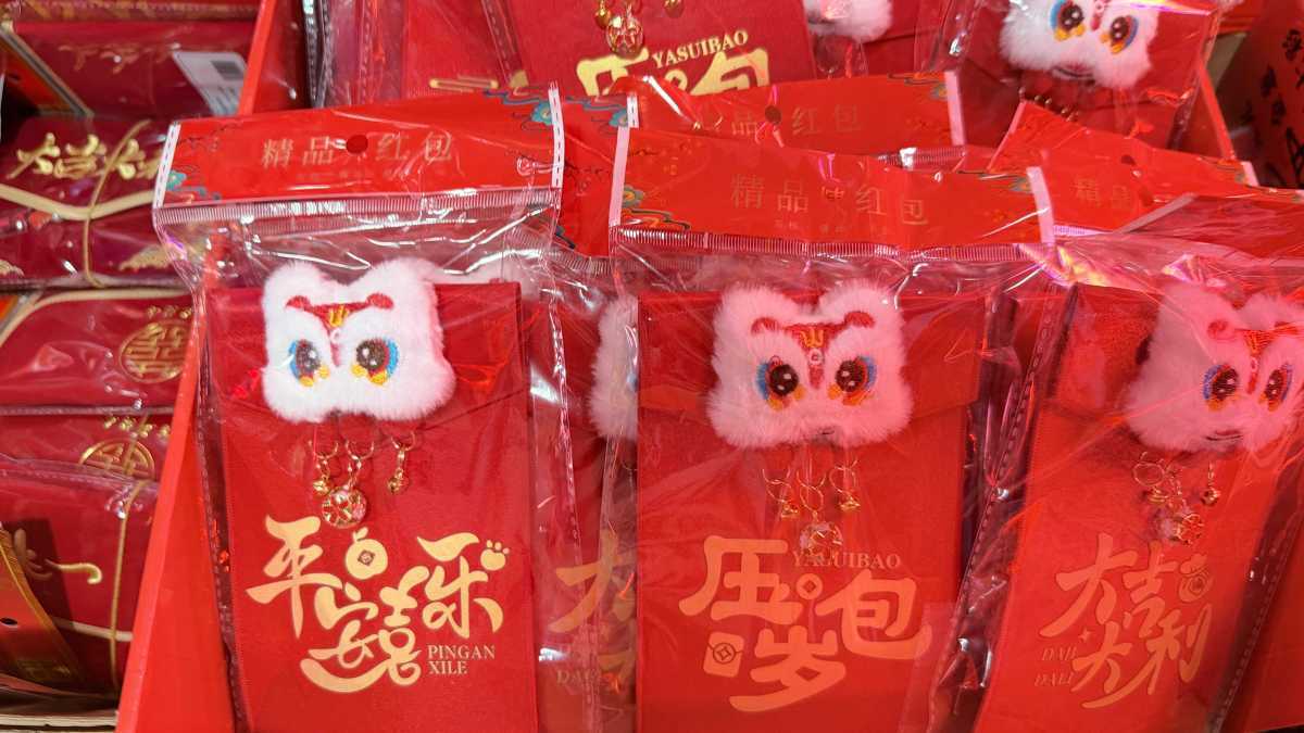 记者注意到,不少摊位上出现了一种设计精巧的布艺红包。红包表面印着花纹、点缀着讨喜的马年饰品,还有一根挂绳,可以把它变成随身背的小包。