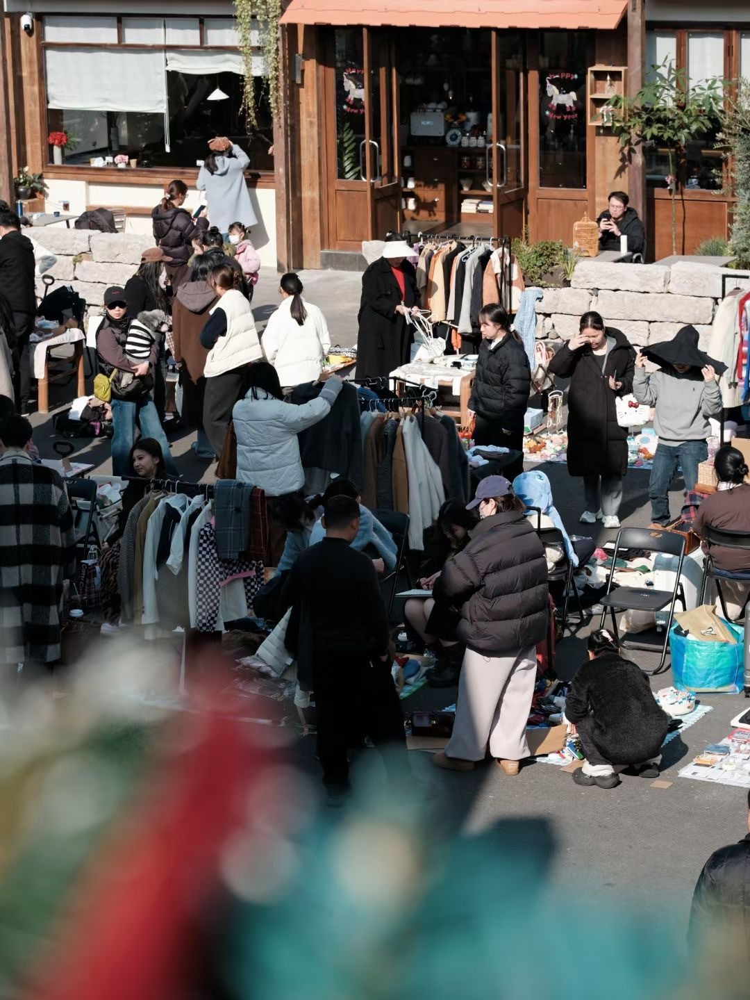 只见园区街道内,有人带来可移动衣架挂了满满一排新大衣,有人把闲置的摆件、书籍、文具摞在野餐垫上,还有人摊开装满旧物的行李箱就算正式开张。