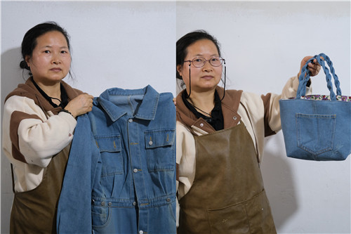 经过章苏美的改造,旧牛仔衣变身环保袋。新华社记者段菁菁摄