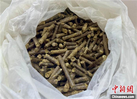 图为水稻秸秆加工而成的饲料颗粒。卢梦梦/摄