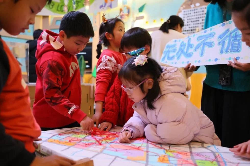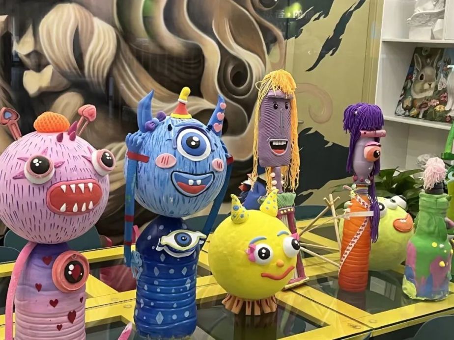 废弃的纸箱、塑料瓶、泡沫塑料等被巧妙地转化成各种有趣ip造型。旧物被重新利用,变得有趣又可爱。在展区中央有东明路街道所有小区学校的地图,地图是由孩子们用闲置的婴儿床床板制成的。