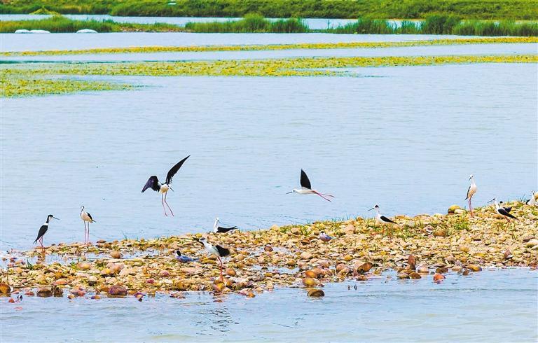 2023年5月9日,安徽省合肥市肥东县长临河镇十八联圩生态湿地,黑翅长脚鹬、鹭鸟在栖息。当地持续推进环巢湖湿地保护工作,生物多样性和生态系统稳定性显著增加。十八联圩湿地修复三期工程成功入选联合国生态系统恢复十年行动优秀案例。陈振/摄(中经视觉)