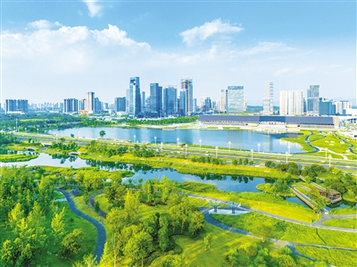 近年来,天府新区坚持“突出公园城市特点,把生态价值考虑进去”,聚力探索以彰显生态价值为导向的城市现代化路径。秉持绿水青山就是金山银山的理念,通过近9年的建设发展,天府新区实现经济总量连续跨越两个千亿级台阶,生态环境质量持续提升,基本形成城绿交融、美丽和谐、宜业宜创的城市格局。