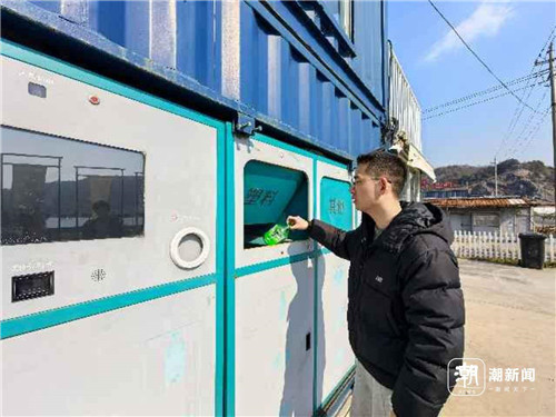 记者在岸边环保仓的智能回收柜投递塑料瓶。记者周文丹/摄