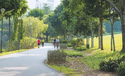 新加坡榜鹅一条公园连道上,民众骑自行车出行。记者 刘慧/摄
