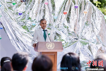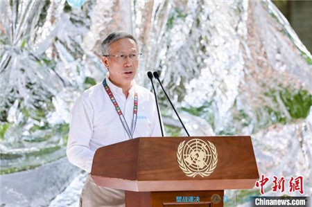 “塑战速决”2023世界环境日主题活动1日在北京举行。图为联合国驻华系统协调员常启德致辞。联合国环境规划署驻华代表处供图