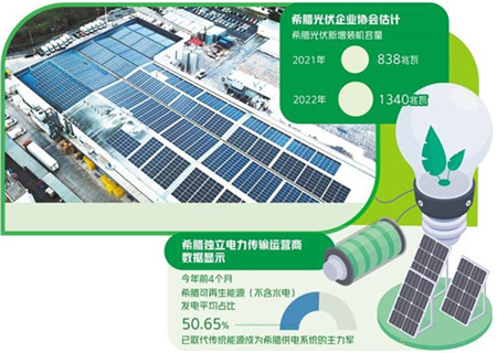 相比其他欧洲国家尤其是北欧国家,希腊拥有丰富的太阳能资源,依托每年充足光照的自然优势,希腊光伏发电产业也迎来快速发展。希腊光伏企业协会发布报告估计,2022年,希腊光伏新增装机容量达到历史新高的1340兆瓦,而2021年这一数字还是838兆瓦,同比增幅接近60%。2022年4月,希腊石油集团斥资1.3亿欧元建立的科扎尼光伏公园揭幕,该光伏公园成为东南欧最大的双面面板光伏公园,总装机容量达204.3兆瓦,每年将产生350吉瓦时的电能,满足至少7.5万户家庭的用电需求。