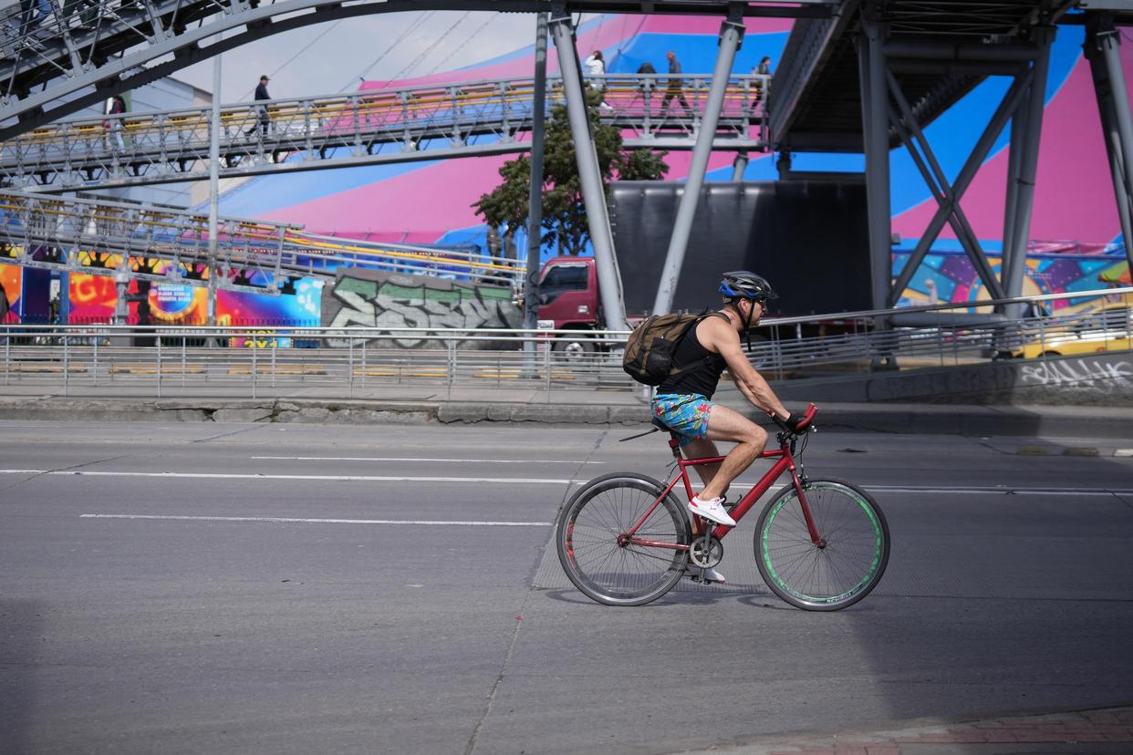 2月6日,一名男子在哥伦比亚首都波哥大骑车出行。