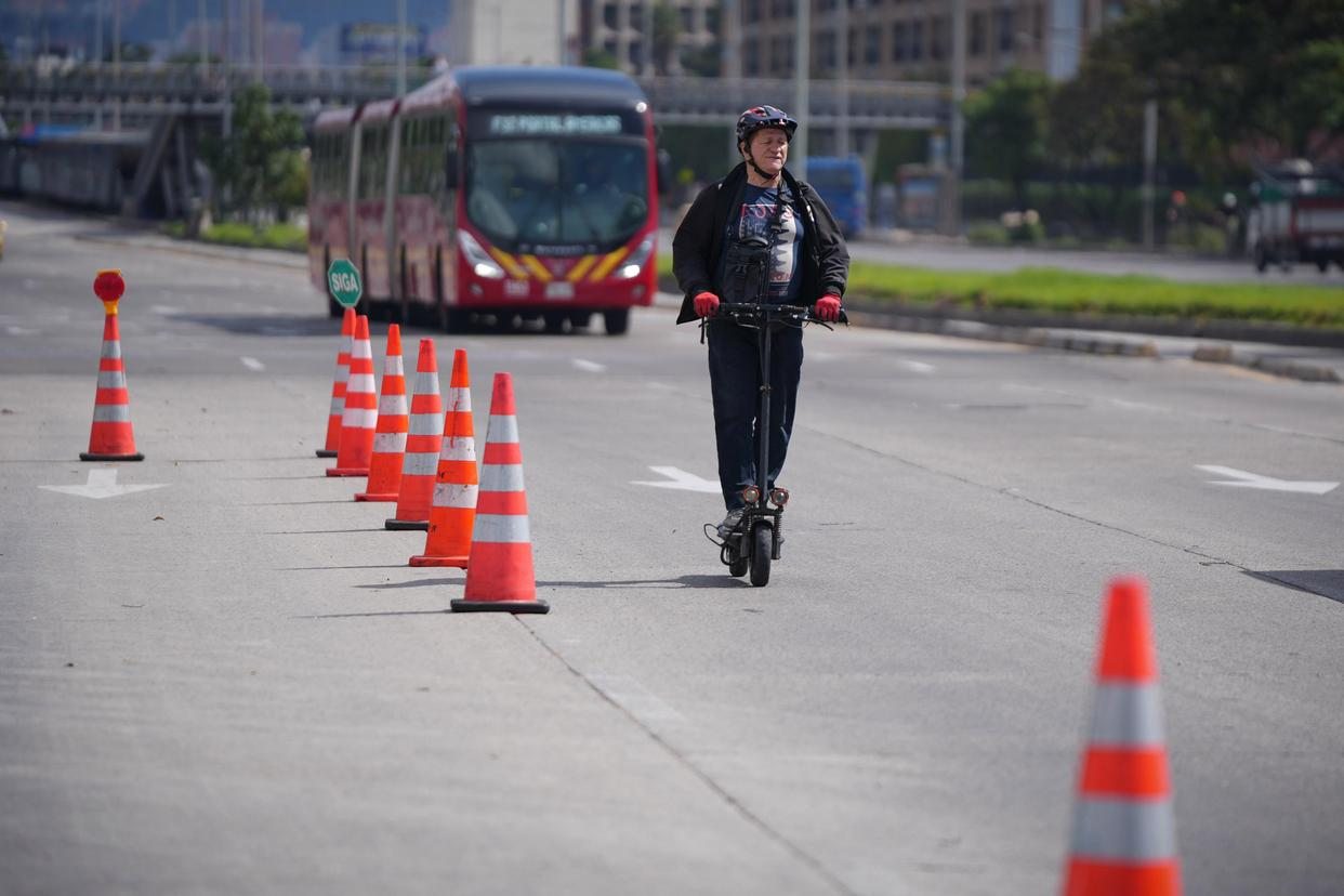 2月6日,一名男子在哥伦比亚首都波哥大乘电动踏板车出行。