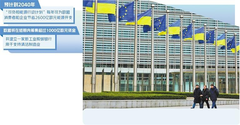 欧盟为此采取了一系列具体措施。欧委会当天还通过了“可负担能源行动计划”,作为“清洁工业协议”的关键组成部分。该计划旨在降低工业、商业和家庭的能源费用,加快清洁能源推广和电气化进程,完善欧盟内部能源市场,减少对进口化石燃料的依赖。预计到2040年,每年可为欧盟消费者和企业节省2600亿欧元的能源开支。欧盟将在短期内筹集超过1000亿欧元资金,并建立一家新的工业脱碳银行,用于支持清洁制造业。这些资金主要来源于创新基金、排放交易计划收入以及《欧盟投资》修订案等渠道。此外,欧盟还将缩短可再生能源项目的审批时间,减少行政程序和监管壁垒,营造更有利于工业发展的市场条件和经营环境。