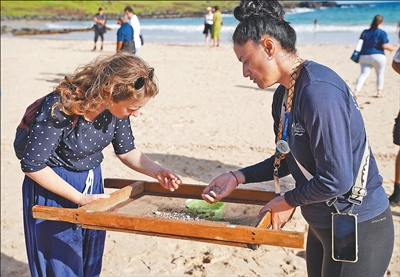 在智利复活节岛,一名游客(左)与当地志愿者用筛网分拣海洋塑料垃圾。记者 朱雨博/摄