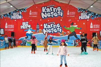1月16日起,土耳其全国中小学进入为期半个月的寒假。为丰富青少年假期生活,该国最大城市伊斯坦布尔市贝伊奥卢区政府在哈斯科伊帆船学校前的空地,临时铺设了免费滑冰场,成为当地儿童最喜爱的假期去处之一。