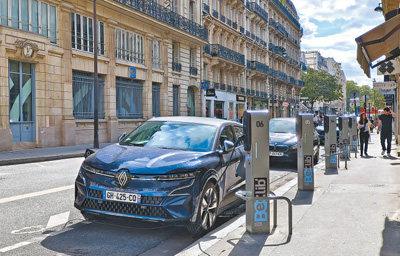 今年上半年,法国加快了电动汽车配套设施安装步伐,全国范围内公共场所充电桩数量于5月份突破10万大关。左图为位于巴黎六区的一排路边充电桩。本报记者 尚凯元/摄