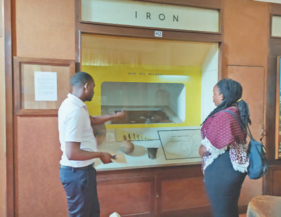 在乌干达国家博物馆内,工作人员向参观者介绍展品。本报记者 黄培昭/摄