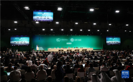 这是12月13日拍摄的联合国气候变化迪拜大会闭幕全体会议现场。在“加时”一天后,《联合国气候变化框架公约》第二十八次缔约方大会(COP28)13日在阿联酋迪拜闭幕。大会就《巴黎协定》首次全球盘点、减缓、适应、资金、损失与损害、公正转型等多项议题达成“阿联酋共识”,具有重要里程碑意义。新华社记者 王东震/摄