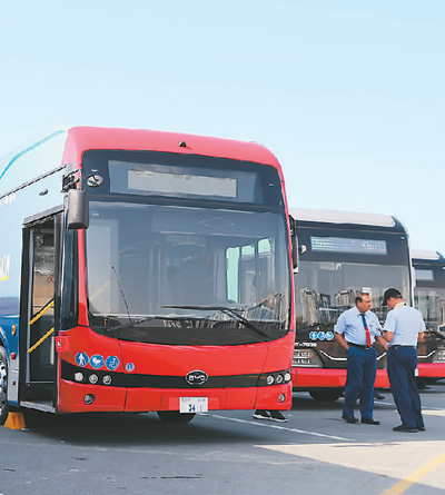 中国品牌的电动车停放在COP28的摆渡车停车场。COP28开幕以来,中国品牌的电动车为本次气候大会提供服务,增添了一道靓丽的风景线。新华社记者 王东震/摄