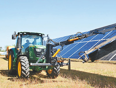 记者采访时,阿尔科雷斯光伏电站正在进行每半年一次的设备清洁。一辆重型清洁车来回穿梭,不到1小时就完成了约200块光伏板的清洁工作(见上图。记者 颜欢/摄)。运维技术人员何塞·罗丹向记者展示:只需轻轻点击手机上的控制程序,将界面上的“自动”模式切换成“清洁”模式,眼前的光伏板便开始缓缓旋转,达到程序设定的倾斜角度,随后开始清洗流程。