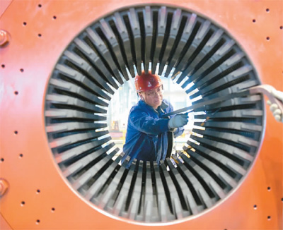 在位于河南省洛阳市伊滨区的中信重工节能环保产业基地发电设备公司生产车间内,工人正在加紧生产。张怡熙/摄(人民图片)