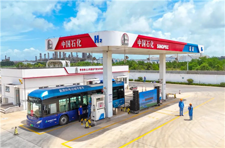 2025年7月23日,山东青岛,一辆公交车在加注燃料电池氢。近日,中国一企业向社会车辆充装加注燃料电池氢突破1000吨,为区域绿色交通发展注入强劲动能。中新社发 张进刚/摄