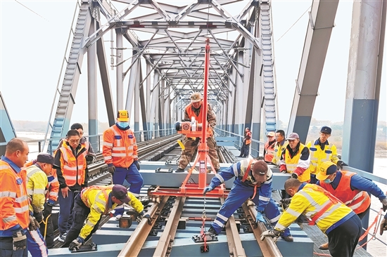 为保证桥枕顺利更换,齐齐哈尔工务段齐齐哈尔路桥车间班组自制吊轨平车,全新的动力系统不再需要职工费力搬运,绳索悬挂装置完全解决桥上作业空间不足的困境。自制吊轨平车投入使用后,大桥换枕效率提升3倍,人力节省60%。