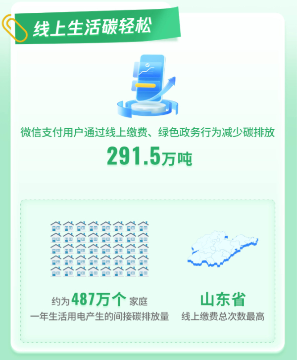 在线上生活场景,2022年微信支付用户通过线上缴费、绿色政务服务累计减少碳排放291.5万吨,约相当于487万个家庭一年的生活用电量。