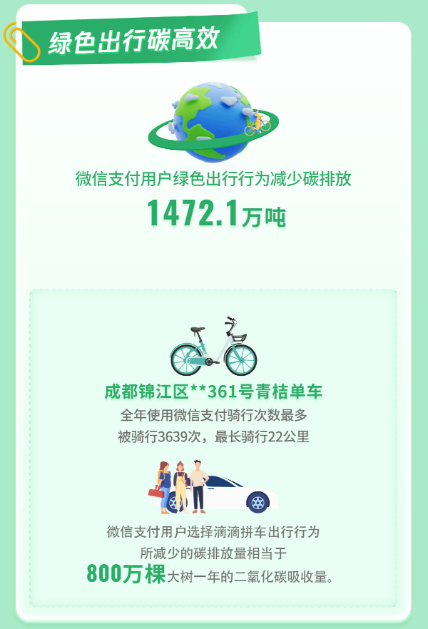 绿色出行方面,微信支付用户通过公交地铁、拼车、共享单车等出行方式累计减少碳排放1472.1万吨。