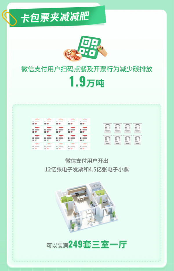 在扫码点餐及开票等场景,微信支付用户使用无纸化微信支付扫码点餐,累计减少碳排放量1.9万吨;2022年,微信支付用户累计开出12亿张电子发票和4.5亿张电子小票。