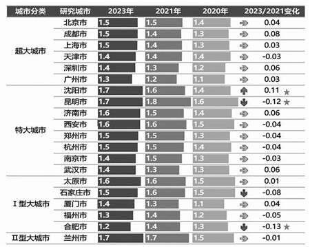 共享单车/电单车骑行活跃用户单次骑行距离,从侧面反映出共享单车/电单车的日常使用目的。《报告》显示,共享单车单次骑行平均距离1.5公里,对比2021年保持相对稳定,仅个别城市呈现小幅变化。沈阳、合肥、昆明等3个城市日均骑行距离变化较为明显,分别增长106米、下降127米和117米。电单车单次骑行平均距离2.3公里,对比2021年普遍下降。石家庄、厦门、宁波等3个城市下降最为突出,分别减少628米、436米、325米。