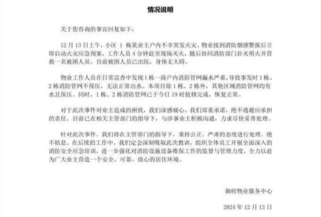 说明中提到,小区物业工作人员在日常巡查中发现1栋一商户内消防管网漏水严重,导致事发时1栋、2栋消防管网不保压,无法正常出水,其他区域消防管网均有水且保压。同时,1栋、2栋消防管网已于13日19时抢修完成,恢复正常。