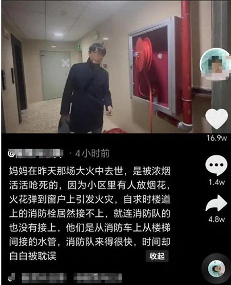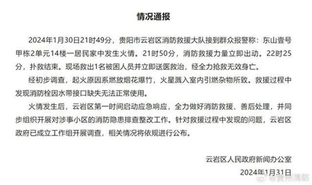 2024年1月30日,贵州省贵阳市某小区因燃放烟花发生火情,一男子称自救期间消防栓无法接水,其母在火灾中去世。