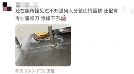 当时她正在洗手间上厕所,结果发现隔壁厕所间有人把东西放在地上,出于好奇,便凑近看了看,没想到发现有人把疑似山姆的蛋糕放在蹲厕的地面上分装,对方还带有专业的蛋糕刀,于是拍下了以上画面。