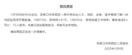 据“魅力桥西”微信公众号消息,河北张家口市桥西区人民政府发布情况通报称,1月4日8时40分左右,张家口市桥西区一菜市场发生火灾,消防、应急、医疗等部门第一时间赶赴现场开展救援。10时10分,现场明火扑灭。12时50分,现场救援工作结束。事故造成8人死亡,15人受伤。伤者已送往医院救治,目前无生命危险。 事故原因正在进一步调查中。
