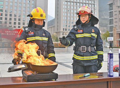陕西省延安市消防救援支队吴起县消防救援大队队员向群众演示如何处理油锅起火。石鑫/摄(人民视觉)
