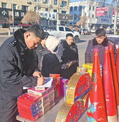 内蒙古通辽市科尔沁左翼后旗公安局治安管理大队联合相关部门,检查辖区烟花爆竹销售点。刘琳琳/摄(人民视觉)