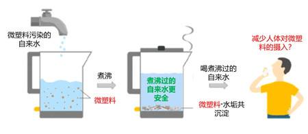 有研究表明,把硬水(指含有较多可溶性钙镁化合物即水垢的水)烧开后能很大程度上将水中的微塑料固定在水垢中,再通过过滤这一简单步骤就能除去水中80%的微塑料。随着水的硬度和烧水温度的提高,去除率甚至可以达到90%。并且即使烧的是软水(指不含或含较少可溶性钙、镁化合物的水),煮沸过程也可以帮助除去25%以上的微塑料。