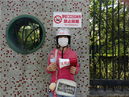 “你好,学校门口不能吸烟!”41岁的艾达指着校门边的禁烟标识,提醒一位正在吸烟的中年男士,声音不高但很坚定。在虹口区外国语第二小学门口,接送女儿放学的艾达很特别:头戴“无烟上海”字样的头盔,背着同主题背包,手里的喇叭循环播放“学校门口禁止吸烟”的提示。近乎倔强的姿态背后,是艾达对抗游烟的决心。