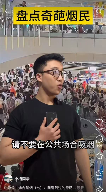 小栖的第一条控烟短视频取名为《劝导公共场合禁烟(一)劝阻游烟》。今年2月5日发布,没想到短短两天阅读就超29万。到3月底,点击已超600万,点赞超4万,这让小栖激动不已。此后两个月,他又接连推出了七个控烟视频,用生动的画面、深入浅出的讲解,普及吸烟对健康的危害。为了拍摄控烟短视频,小栖还专门咨询了律师,如何才能做到既拍摄画面又不侵犯肖像权,律师建议他尽可能不拍脸,只拍吸烟的手或者当时的场景,拍摄的视频不能用于商业用途,在社交平台上发布一定要打码等。