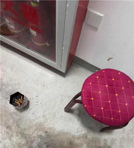 小江所住楼层的楼梯间,摆放了凳子和烟灰缸。受访者供图
