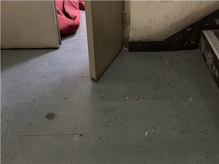 4月23日下午,新京报记者来到东城区通正国际大厦,进入楼梯间的瞬间,一股烟味就扑面而来。从13楼往下走,到10楼烟味变重,在9楼楼梯间的门口,记者发现了几个刚熄灭的烟头,周边散落着烟灰。