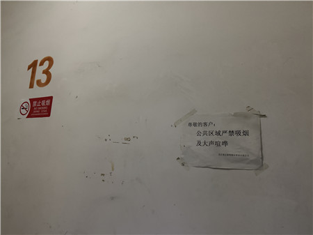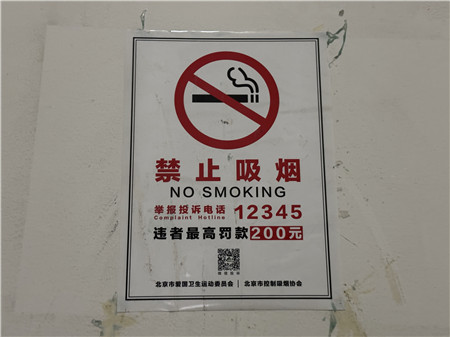 通正国际大厦每层楼梯的墙上都贴着“公共区域严禁吸烟”的提醒,个别楼层还贴着举报投诉电话、违者最高罚款200元的标牌,落款是北京市爱国卫生运动委员会、北京市控制吸烟协会。