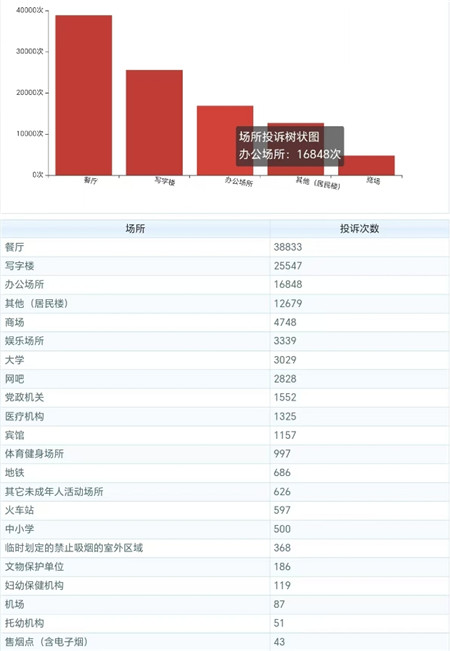 据北京市控烟协会前会长张建枢介绍,截至目前,“无烟北京”微信公众平台接到市民对违反《北京市控制吸烟条例》在公共场所违法吸烟的投诉举报共116145个。其中,写字楼(25547个)、办公场所(16848个)、其他(居民楼)(12679个),均位居前列。