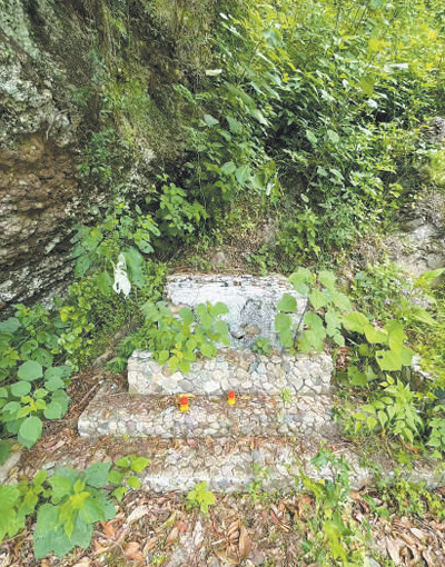 曹金库牺牲后,他的遗骨被安葬在老家,每年清明节都有不少群众前往追悼缅怀。2015年前后,仙居县有关部门在曹金库烈士的牺牲地——沙地村青山脚下,修建了烈士纪念碑(见图一),供大家更加方便地祭拜烈士。然而,几年前,有人为修建私人住宅,把通往烈士纪念碑的道路截断占用。